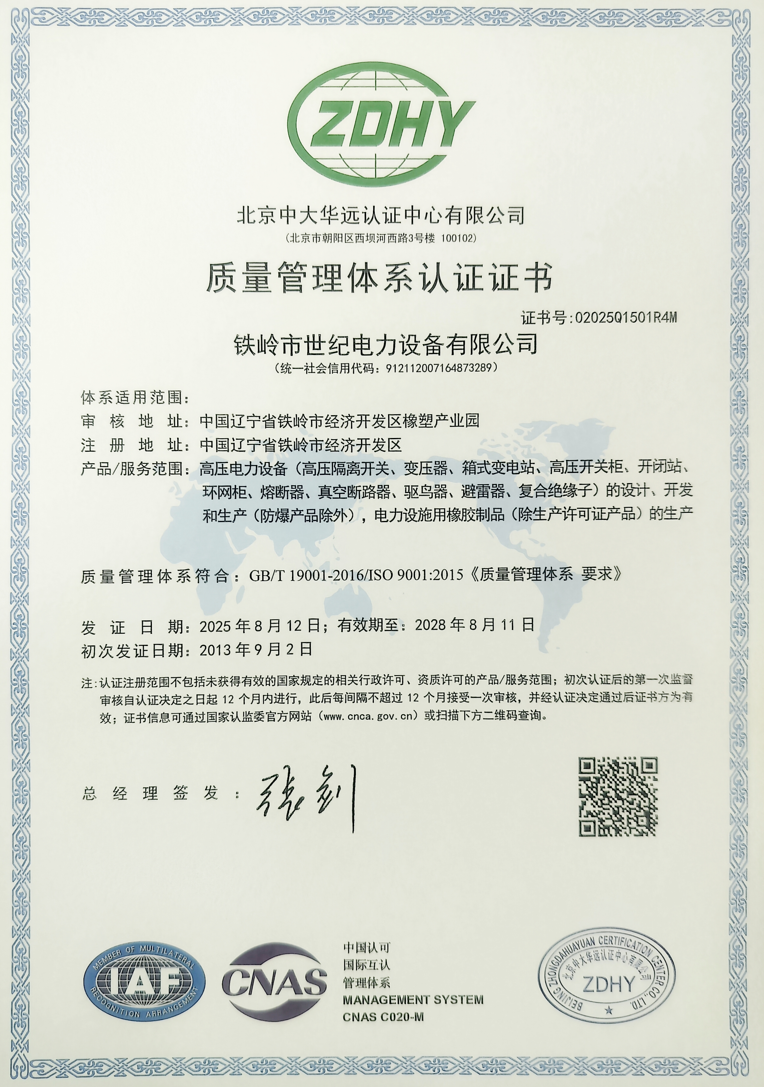 鐵嶺市世紀(jì)電力設(shè)備有限公司是集科研開發(fā)、生產(chǎn)制造、用戶服務(wù)于一體的國(guó)家高新技術(shù)企業(yè),始建于1999年,位于鐵嶺經(jīng)濟(jì)開發(fā)區(qū),占地面積5萬余平方米,建筑面積2萬余平方米。主要從事國(guó)家電網(wǎng)配套戶外高低壓隔離開關(guān)、電力電纜、變壓器成套裝置、高低壓開關(guān)柜、箱式變電站、絕緣子等產(chǎn)品的研發(fā)、生產(chǎn)和銷售。公司現(xiàn)有國(guó)家發(fā)明專利6項(xiàng)、實(shí)用新型專利9項(xiàng),公司通過了ISO9001國(guó)際質(zhì)量管理體系認(rèn)證、ISO14001環(huán)境管理體系認(rèn)證和ISO 45001職業(yè)健康安全體系認(rèn)證。